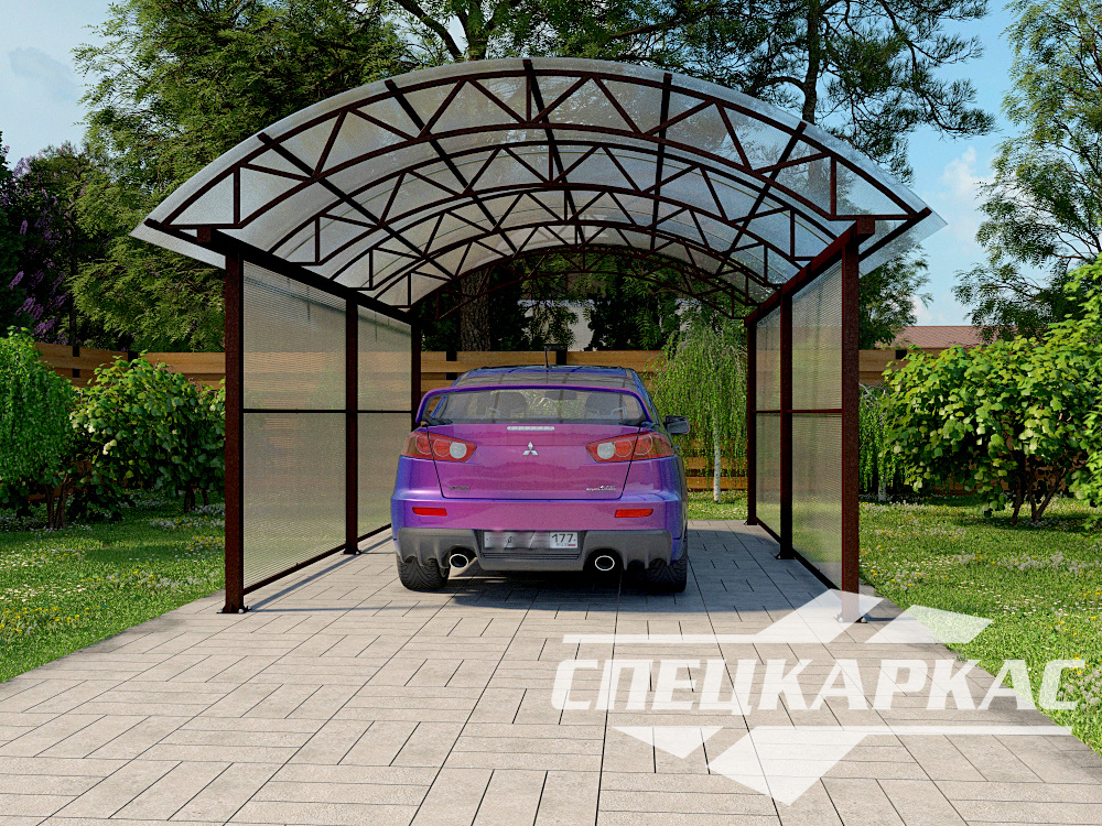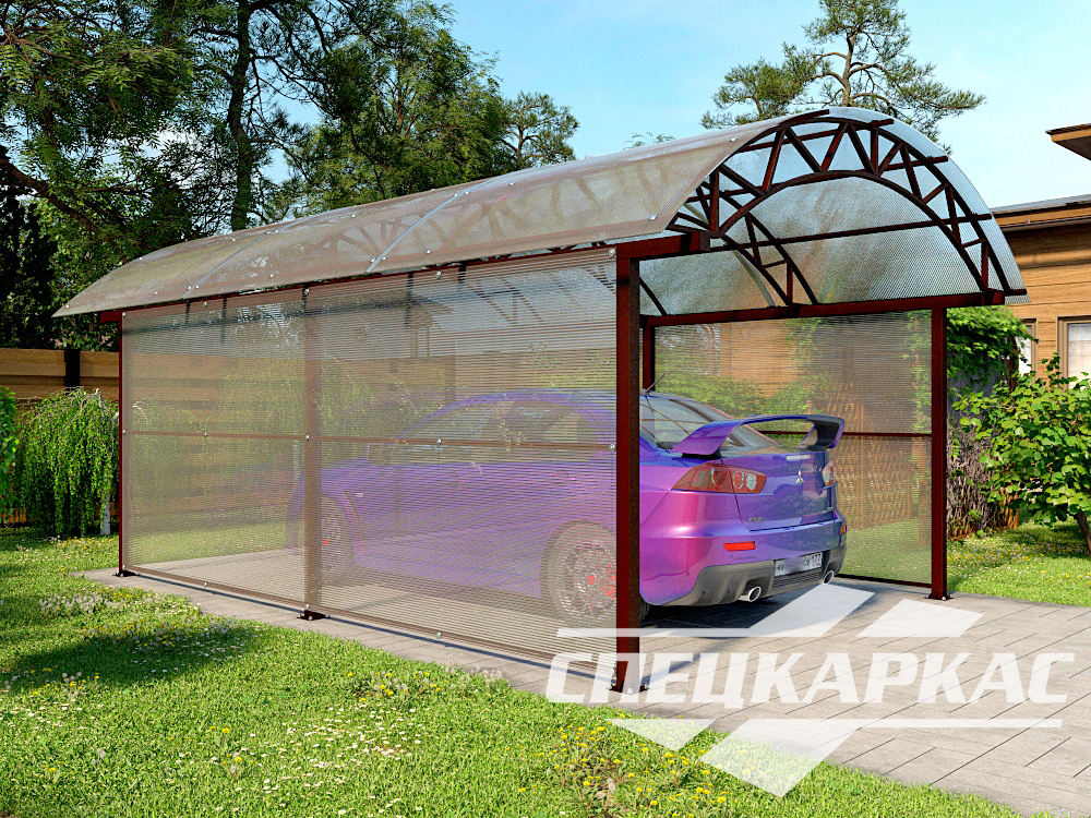 Компания «Спецкаркас» предлагает козырьки, беседки, навесы из поликарбоната любого типа и формата: одно- и двухскатные, прямые и наклонные, арочные и даже куполообразные.